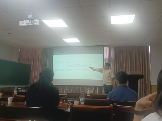 安徽大学刘乐乐博士的报告题目是《Normalized Laplacian hypermatrices and isoperimetric inequalities for uniform hypergraphs》。刘乐乐博士首先向大家介绍了超图相关问题的研究背景以及研究进展,并向大家报告了他们团队的最新研究。最后,刘乐乐博士与本团队教师就超图得谱问题进行了探讨。刘乐乐博士讲解细致、条理清晰,青年教师和员工听后受益匪浅,并对接下来本团队可以进一步研究的问题给出了十分有建设性的意见及指导。