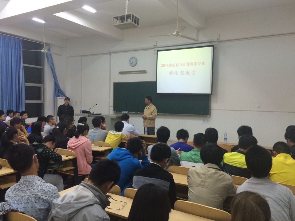 数学与应用数学专业的交流会由院办主任姜峰主持,他对2014级新同学的到来表示热烈的欢迎并提出殷切的期望。接着,经理助理付应雄老师从数学专业主干课程、专业实力介绍、团队队伍、学科和实验室介绍、特色研究方向、就业前景以及如何就读大学几个方面为大家做了详尽的介绍。优秀员工代表曹广荣结合自身的成长经验和体会,号召2014级新生要扎实学好专业知识,让老员工活变的充实而有意义。