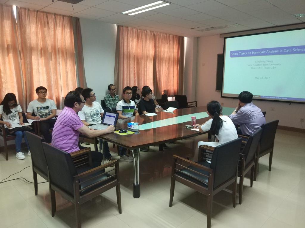 2017年5月14日,美国Sam Houston State University王建忠教授应邀来访公司,并为相关方向研究生和教师做了题为《Some Topics on Harmonic Analysis in Data Science》的学术报告。