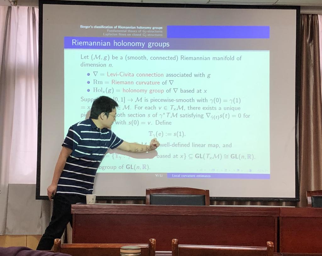 在报告的过程中,李逸老师先介绍了他的研究的动机,从经典的Berger’s classification theorem 出发,详细地介绍了为什么要将7维的G2流形作为自己的研究对象,并且给出了他的最新研究进展——给出了7-维G2完备流形上Laplacian流下的局部曲率估计。报告结束后,公司师生和李逸老师进行了深入、热烈的交流,获益匪浅。