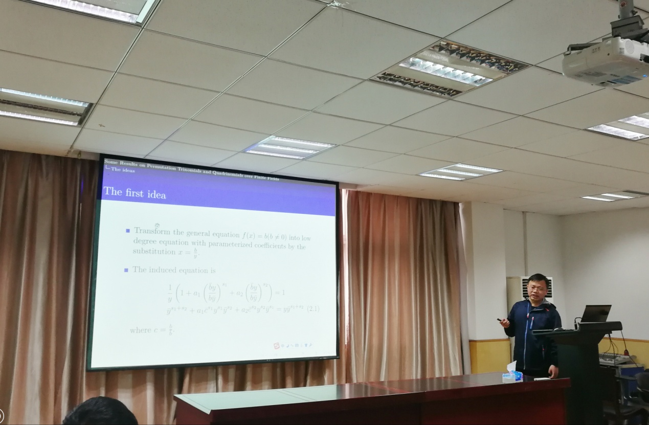 报告中,涂教授分两个部分展示了他最近的研究成果,关于三项式和四项式置换多项式的构造问题,并给大家详细介绍了其研究过程的核心思想及置换多项式研究的基本方法。