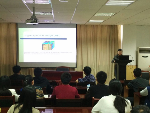 李教授的报告主要讲解了高光谱图像的原理及其应用,详细讲解了高光谱图像的处理以及用算法对高光谱图像进行识别与分割,生动形象地介绍了算法在高光谱图像中的应用,引起在座师生的浓厚兴趣。