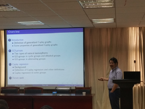 刘伟俊教授的报告题目为“广义凯莱图”,首先给出了广义凯莱图的定义和性质,其次与凯莱图作对比,将凯莱图中CI-群的概念推广到广义凯莱图中GCI-群的概念,随之给出了GCI-群的定义以及相关结论、例子,然后提出凯莱回归,并通过例子对定义、结论作了解释,最后对未来的工作包括GCI-群的分类等进行了展望。