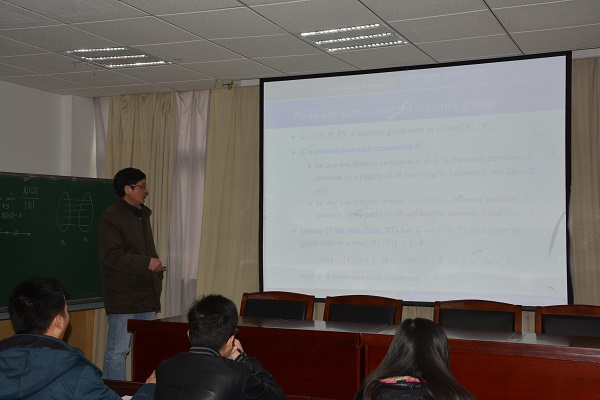 胡智全教授在报告中关于图的弱范圈性和弱偶范圈性介绍了国内外的研究现状。证明了每一个最小度至少为n/3 + 5的2n阶的平衡二部图都是弱偶范圈的,从而证明了每个阶数至多为6k-38的2-连通k-正则二部图都是弱偶范圈的。