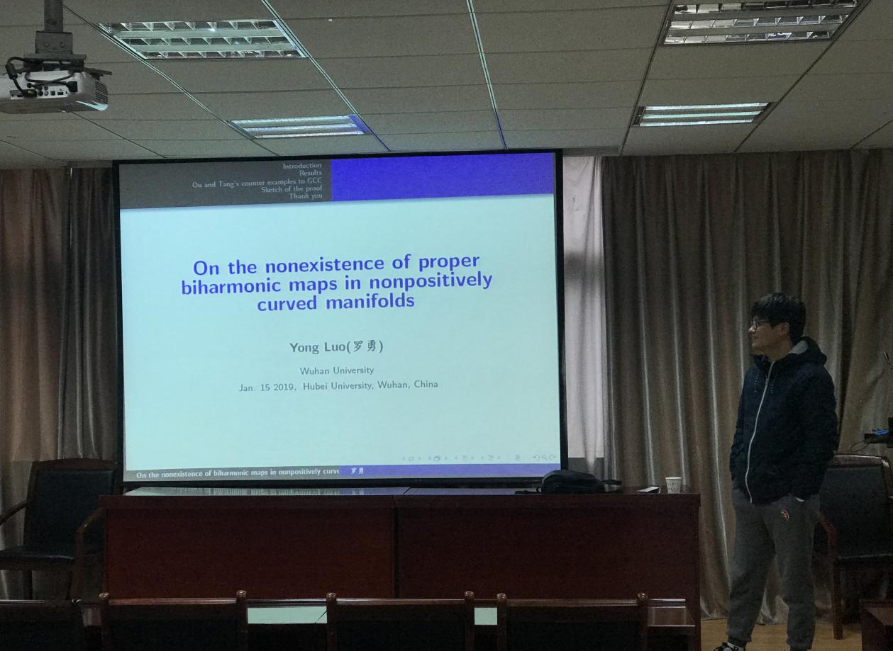 2017年1月15日上午,武汉大学数学与统计公司罗勇教授来公司讲学,在365英国上市公司201报告厅作了题为On the nonexistence of proper biharmonic maps in nonpositively curved mannifolds的学术报告。听了罗勇教授的讲座,全体师生获益颇多,受益匪浅。