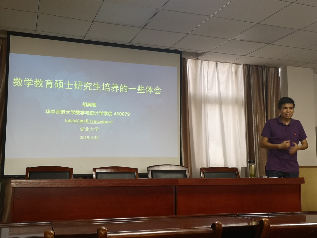 2019年9月30日上午,华中师范大学胡典顺教授应邀来访公司,并为相关专业的教师与研究生做了题为“数学教育硕士公司产品的一些体会”的交流报告。
