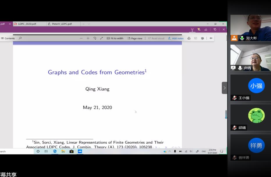 2020年5月21日下午,美国特拉华大学(University of Delaware)向青教授为公司部分老师和研究生带来了一场精彩的线上学术报告,报告通过腾讯会议在线举行,旨在帮助同学们理解几何、编码和图之间的关系。郑大彬教授主持本次会议,365英国上市公司经理曾祥勇教授以及数十名研究生参与报告的听取、讨论。