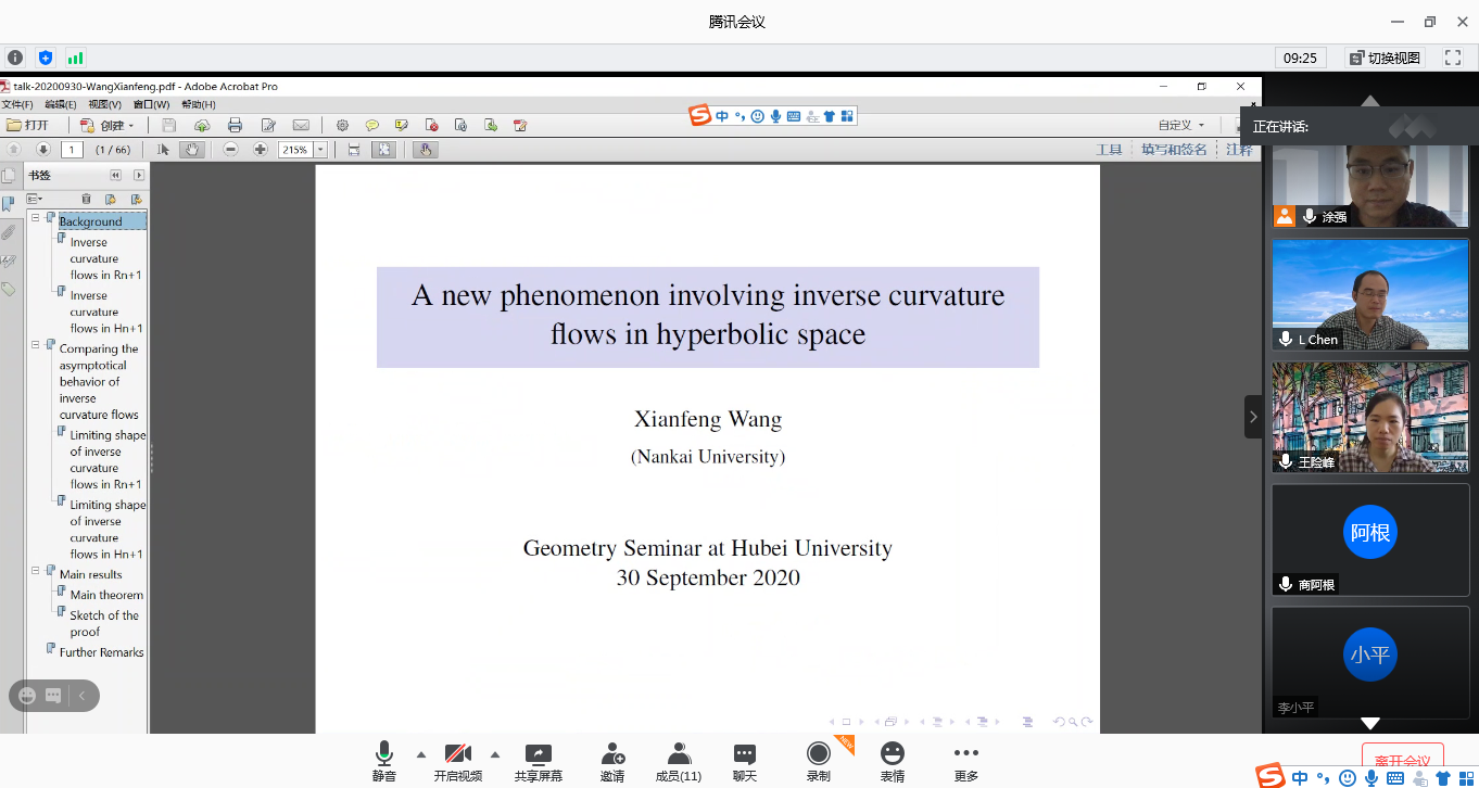 王险峰教授报告的题目为《A new phenomenon involving inverse curvature flows in hyperbolic space》,在这次报告中我们主要讨论了逆曲率流方面的内容,王险峰教授在报告的开头给我们举出了一些曲率函数的例子,然后分别就逆曲率流在欧式空间和双曲空间的内容做了一些详细介绍和对比,加深了我们对内容的理解,报告的最后主要给我们详细的讲解了她最近所做的一些逆曲率流方面问题的的主要结论和证明的方法步骤,并且向我们表述了她关于逆曲率流的一些主要的想法,对我们具有极大的启发性。