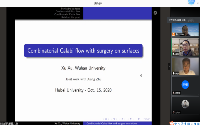 徐旭教授报告的题目为《Combinatorial Calabi flow with surgery on surfaces》,计算表面均匀化的map一直是一个难题,在这次报告中我们将使用组合Calabi流进行顶点缩放来解决这个问题,为了处理组合Calabi流中可能出现的奇点,我们通过边缘翻转对流进行手术,我们将证明对于封闭表面上的任何初始平面或双曲线锥度量,手术中组合Calabi流始终存在,并且在进行有限次手术后,其收敛速度呈指数级增长,收敛性与初始的三角无关。
