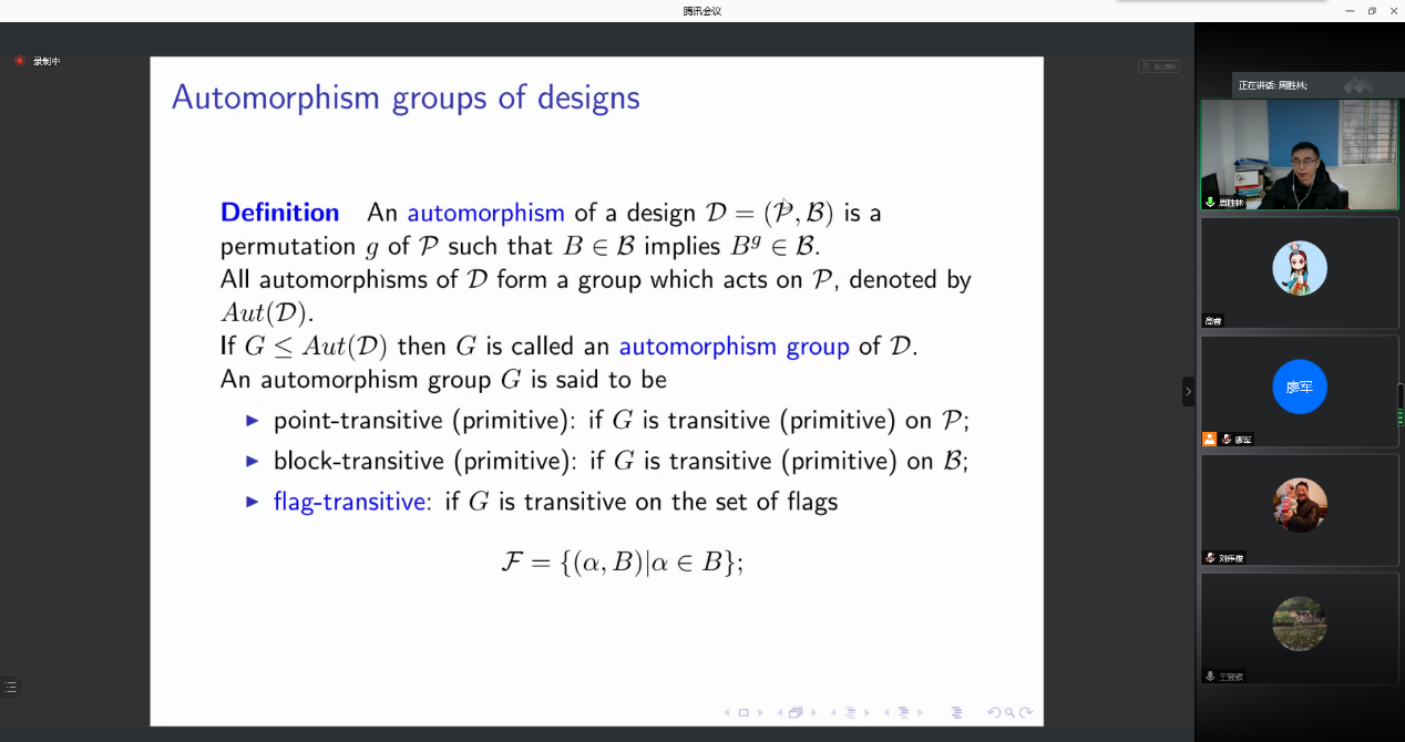 周胜林教授做了题为“Flag-transitive, point-imprimitive 2-(v,k,lambda) symmetric designs with k and lambda prime power”的报告,首先介绍了设计的定义和一些基本事实,以及其自同构群,然后介绍旗传递2设计,对于不同的参数、对称与非对称的不同情形给出了相应结果。
