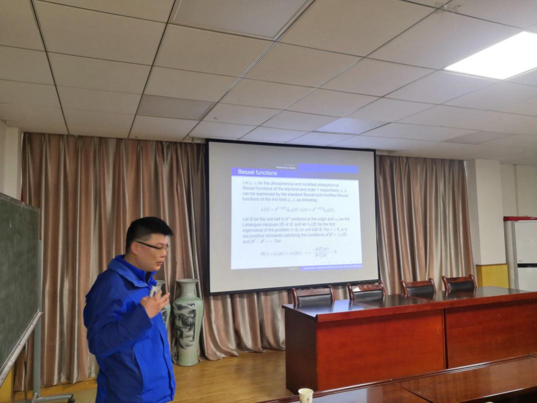 报告中,杜锋教授主要介绍了近期他与合作者得到的n维欧氏空间中的有界区域上双调和算子的平板自由振动问题的前(n-1)个非零特征值倒数和的谱等周不等式,并就相关问题与参会师生进行讨论。