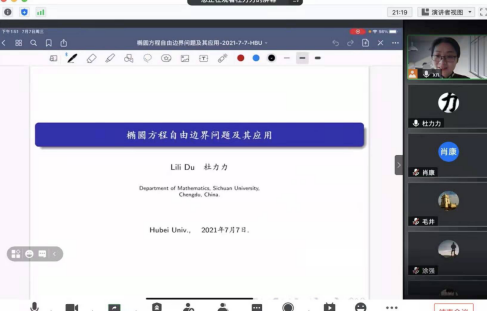 2021年7月7日下午,四川大学杜力力教授应公司向妮教授邀请,为几何团队师生作了题为“椭圆方程自由边界问题及其应用”的线上学术报告。