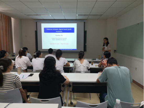 2021年9月17日下午,华中师范大学胡小兰副教授应邀来访公司,在院203报告厅为公司师生做了题为“ Relation between degree-based graph invariants ”的学术报告,报告由公司的刘慧清教授主持。来自运筹学与控制论专业的教师、博士和硕士研究生参加了本次学术报告。