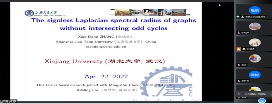 张晓东老师的报告题目是《The signless Laplacian spectral radius of graphs without intersecting odd cycles》, 张晓东老师首先向大家介绍了报告相关的概念以及研究背景,接着就向大家报告了他们团队关于没有相交奇圈的图的无符号拉普拉斯谱半径的研究成果。