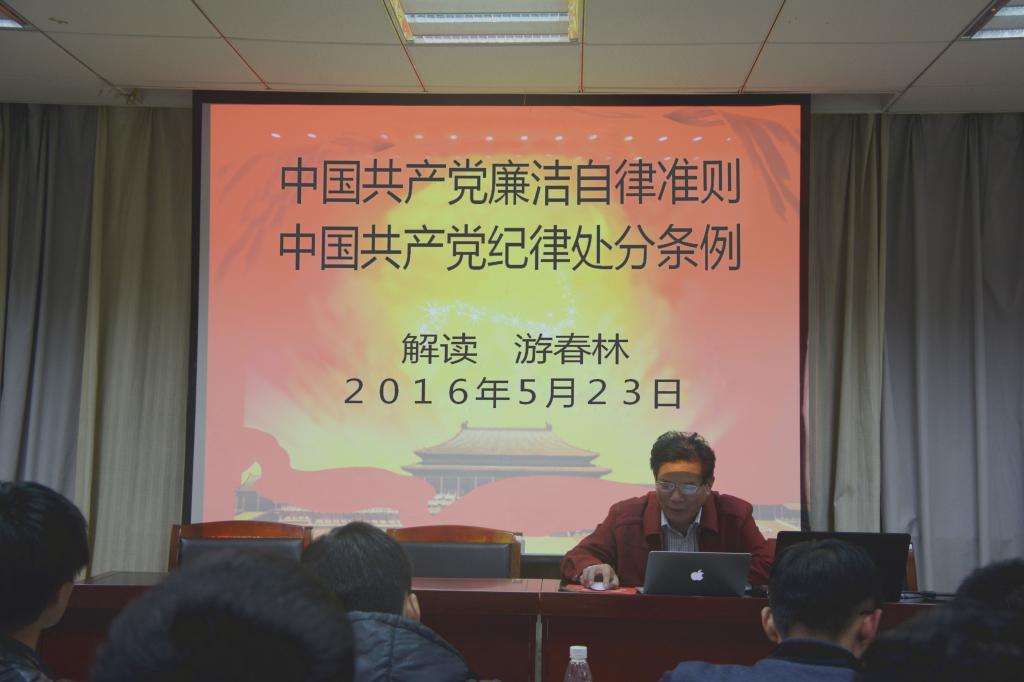 游书记为全院教职工上了一堂廉政党课,主题为深入解读《准则》和《条例》。游书记从五个方面进行了解读,包括制定、修订《准则》《条例》的意义和内容;制定、修订《准则》《条例》的必要性;《准则》《条例》全面性、实用性;新条例具体内容;中国共产党纪律处分条例修订说明。