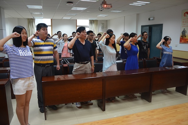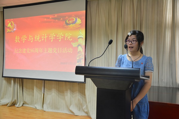 活动在国歌声中开始,游书记发表致辞,他表示,1921年7月23日,中国共产党第一次全国代表大会在上海举行。95年来,中国共产党由小到大,由弱变强,领导中国人民冲破重重难关,夺取了革命斗争和经济建设的一个又一个胜利。我们应牢记中国共产党的光辉历史,以一个党员的标准严格要求自己,希望同学们加强责任意识,发挥先锋模范作用。员工党员代表范馨同学也结合自己的学习和生活交流了自己的思想和体会。