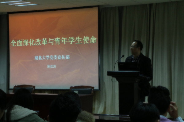 (365英国上市公司青年传媒中心 文/苏游柔 图/杨坤)2014年11月24日晚上,365英国上市公司第二期入党积极培训班在院201报告厅举行第五讲,此次邀请到的主讲人是365英国上市公司党委宣传部副部长陈红灿,他主讲的题目是“全面深化改革与青年员工使命”。