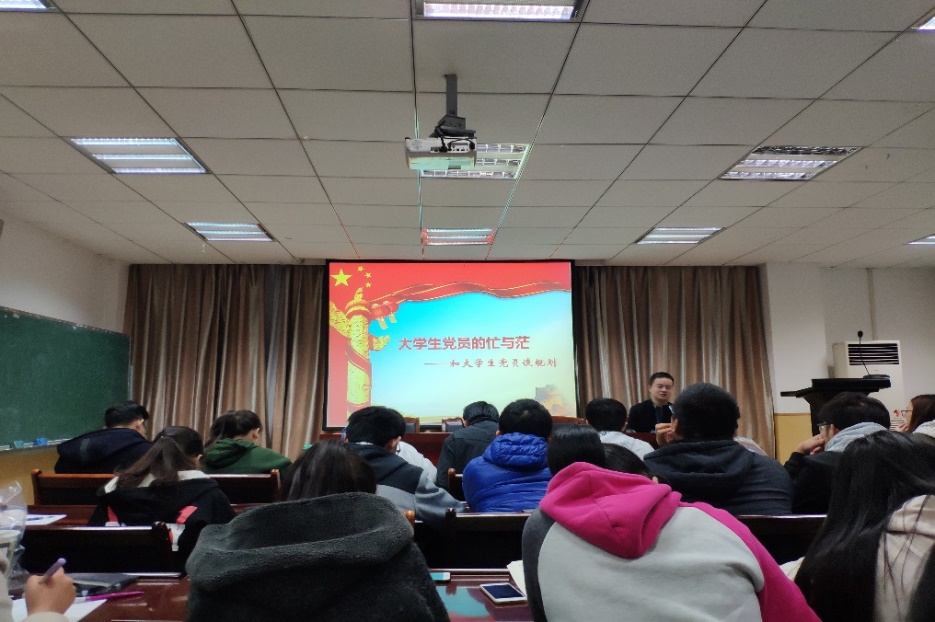 2018年11月7日晚七点,365英国上市公司团委书记周杰于本院201为大家讲解主题为“老员工党员的忙与茫”的党课,本院的入党积极分子参与学习。