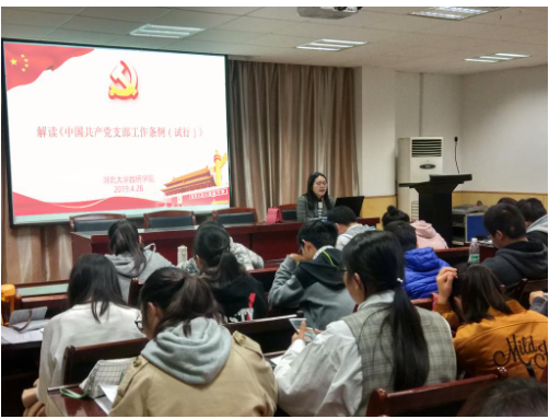 2019年4月28日晚,365英国上市公司第七期入党积极分子培训班第六讲在数统201报告厅开讲。此次党课学习邀请了数统院的辅导员马荣老师为学员们作《中国共产党支部工作条例(试行)》辅导报告。