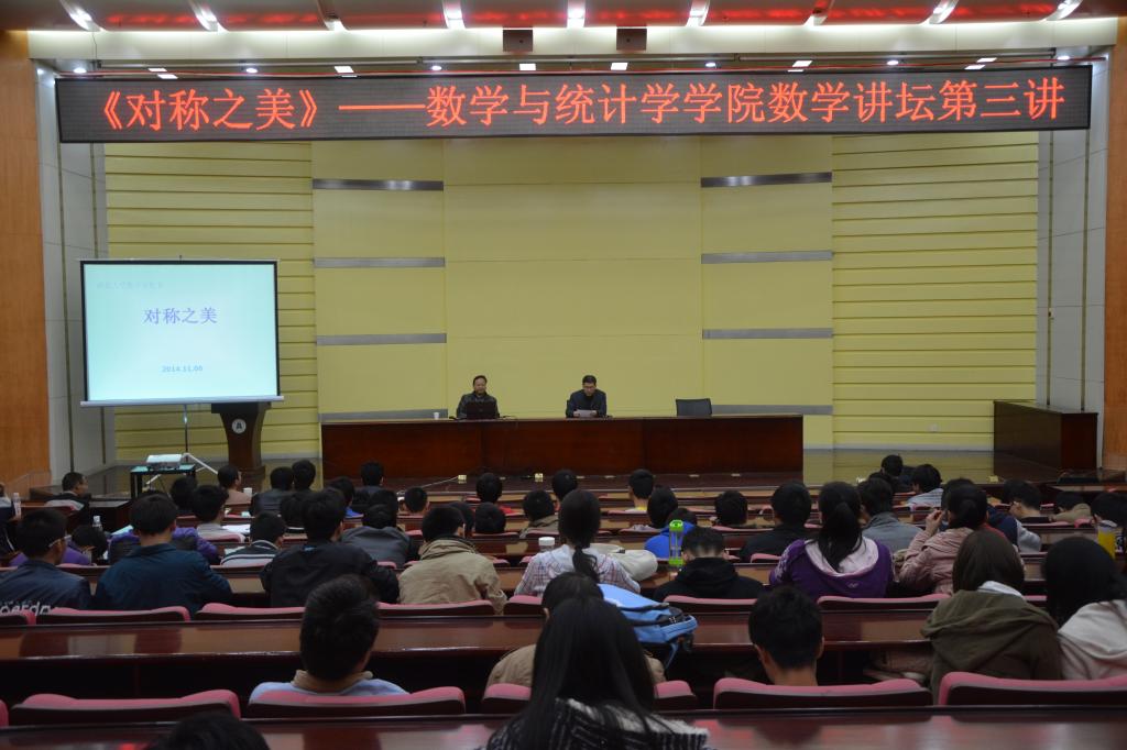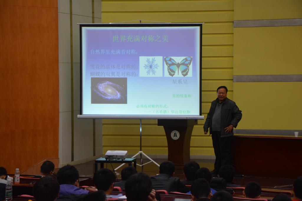 张继平以此次数学文化节“传播数学文化、品味数学之美”的主题开场,引入数学之美:简单的、以真为基础的东西就能给人美感。他用司马迁著《史记》的例子将美拉近现实,引出美的标准与原则:“对称”。然后联系古今中外从多个角度解析“对称”,并解释了数学中多项式的对称。由此,研究对称性的科学——群论顺理成章被提出。张教授还详细讲解了群论的发展史,并介绍对称多项式的基本定理、有限单群的分类定理、奇阶群定理等经典定理,这些定理完美的展现出了数学中对称之美。