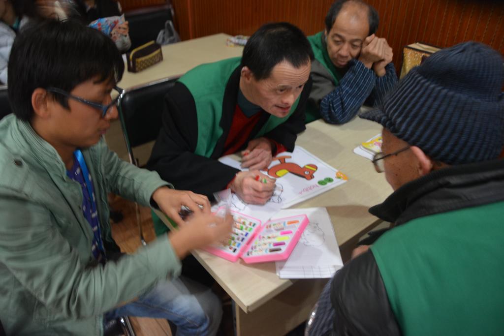 活动结束后,一些志愿者私下和一些智障朋友进行交谈与玩耍。劳英驰便是其中一个,不仅教他们画画,还找出一张习近平的照片要他们认识。在志愿者即将回去之前,志愿者与智障朋友一起合照了一张。