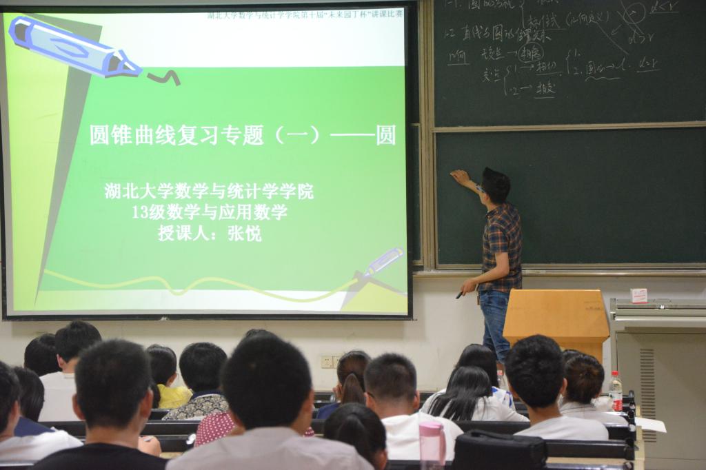 7点,比赛正式开始,在主持人严谨有序的引导下,三个比赛场地的选手们个个摩拳擦掌,带着“欲与天公试比高”的热情和信心,18位选手各有千秋,特色鲜明,有沉稳的、幽默的、富有哲理的……选手依托课件显示,结合板书内容,通过实例讲解,将晦涩难懂的数学公式、公理以及实际问题转化为通俗易懂的内容,他们声情并茂,在讲解的同时还不时与台下的观众互动,调动起“模拟课堂”的课堂气氛。