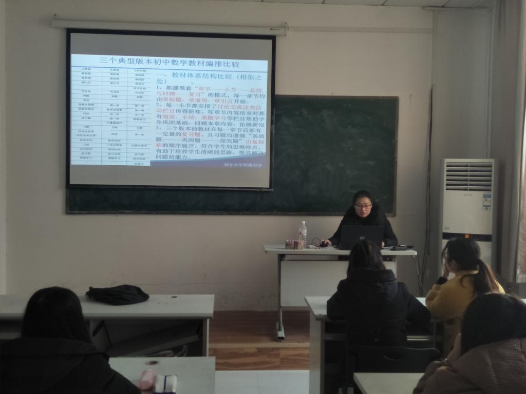 杨老师首先将三个典型版本初中数学教材的编排进行了比较。她指出,人教版较重视章节的知识结构与思考环节,北师大版强调学习目标与总复习的设计,而苏教版注重计算机操作与教学活动。之后,她将人教版教材的编写意图向同学们作了介绍。初中数学教材内容大体可以分为“数与代数”、“图形与几何”、“统计与概率”和“综合与实践”四个方面,人教版教材的编写具有体系结构的创新,要用欣赏的眼光、员工的眼光和质疑的眼光去研读教材,才能体会到教材编写的精妙所在。