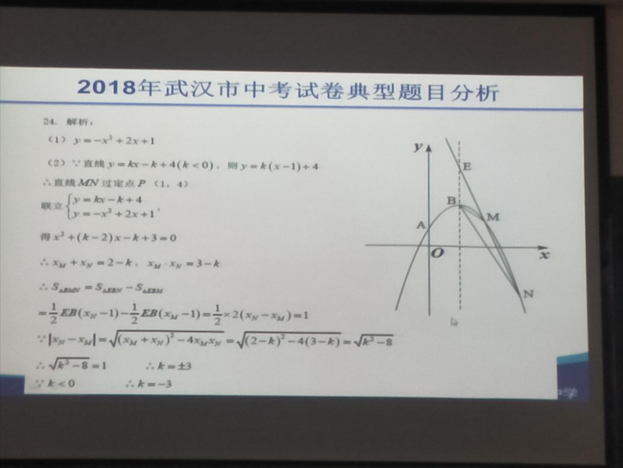 接下来,杨老师对武汉市中考试卷进行了分析。杨老师认为,武汉市中考重视员工对基本方法、基本知识、基本技能的考察,试题一般有多种解法,大多数题目都能从课本上找到影子。她以2018年中考试卷为例,将题型分布、考察内容及考点难度向同学们作了介绍,并着重讲解了选择和解答题中的压轴部分。