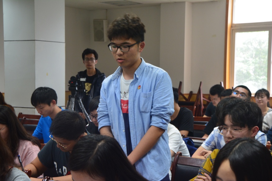 随后团支委向每位成员分发五四知识记录手册,给予每位团员3-5分钟的自主学习时间来了解五四运动的相关知识。在学习时间结束后,主持人依次的公布五四知识题目,全体团支部都可通过举手抢答,回答正确记分,最终20道题目回答完成后,总分前6名获得由团支部提供的奖品。抢答环节十分激烈,各位同学以从中进一步巩固学习了五四相关知识。在团日活动的最后,由主持人带领大家对着团旗进行宣誓。