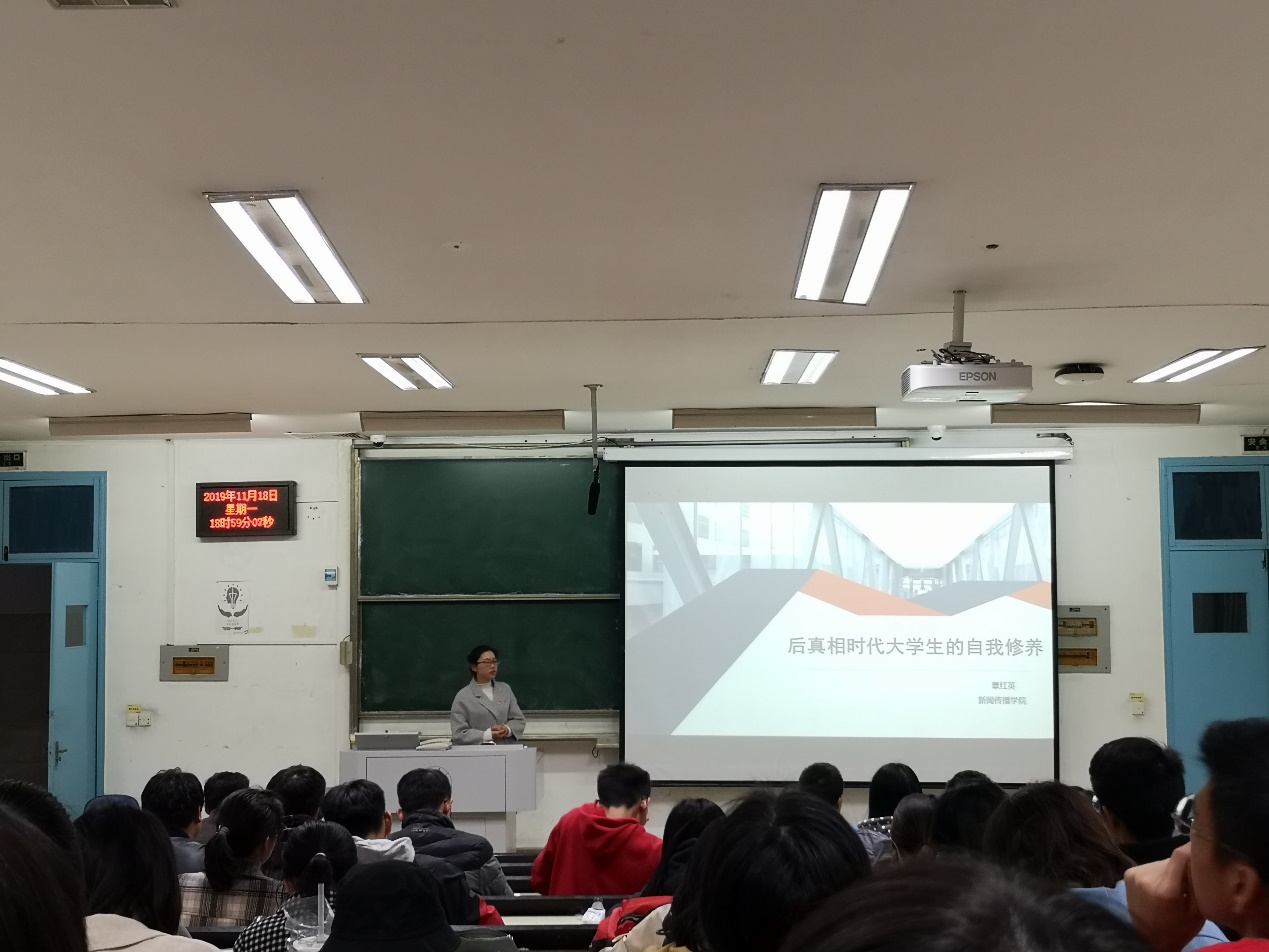 365英国上市公司第二期团课学习于2019年11月18日下午19:00在教四209教室进行。此次讲座有幸请到新闻传播公司团委书记覃红英老师为同学们上课,本次团课的主题为“后真相时代老员工的自我修养”。