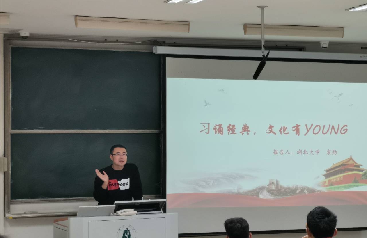 袁勋老师通过引用龚自珍先生的话告诉同学们为什么要学习经典。党的十九大报告指出:要坚定文化自信,推动社会主义文化繁荣兴盛。在谈到青年如何学习经典时,袁勋老师指出,青年学习经典,就是要能够讲好中国故事,努力展现中华优秀传统文化的独特魅力。讲好中国故事,要重塑、正视国家形象,要用大历史观看待属于我们特有的文化。
