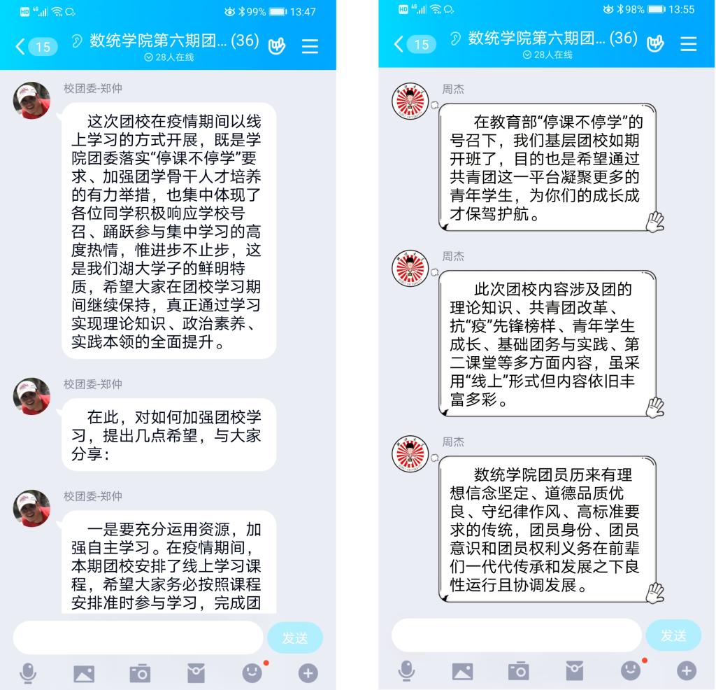 仪式在分享团歌音频中拉开帷幕,校团委副书记郑仲在线参加开班仪式,他对学员提出三点希望:一是充分运用资源,加强自主学习。按时完成学习任务,做到学有所思,学有所获;二是积极参与实践,开展志愿服务。作为新时代的青年团员,在关键时刻贡献自己的青春力量;三是统筹安排作息,科学防控病毒。