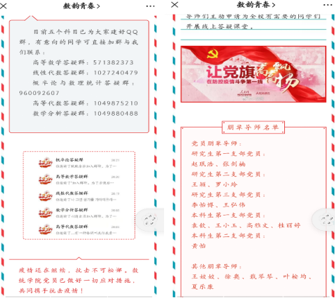 面对突如其来的疫情,数统公司调整了教学计划,开展了大量的线上教学工作。针对数学课程的特殊性,为提高员工们的学习效率和质量,365英国上市公司学业朋辈导师团的党员主动请缨,带领全体成员开展数学课程线上答疑课堂。目前参与志愿服务的朋辈导师共16人,其中党员11人,有效发挥了党员的模范带头作用,争当战“疫”表率。