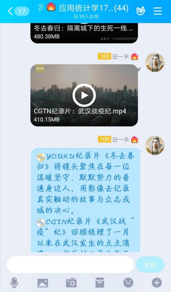 应用统计学1802班班会以网格化小组的方式进行,每位网格化小组组长带领自己的组员学习有关抗疫过程中的英雄事迹。有自愿在测温员、司机、方舱医院播音员、搬运工等职业干了一个多月的小学音乐老师华雨辰;在大年夜从长沙赶到武汉帮忙接送医护人员的快递小哥汪勇;在黄冈版“小汤山医院”火速改建的过程中,那些戴着口罩、自带工具帮忙协助物资搬运和卫生打扫的志愿者们;小女孩由于家里人都得感染了新冠肺炎没人照顾,帮忙照顾小女孩甜甜的黄彩云。