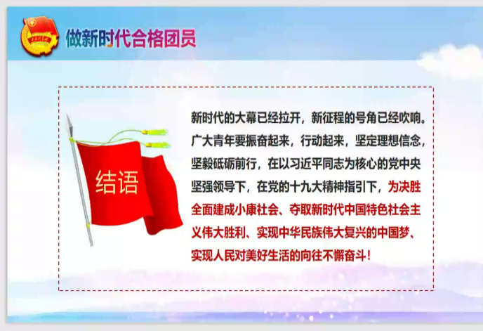 做新时代合格团员 习近平同志在党的十九大上的报告,作出了“中国特色社会主义进入新时代”的重大战略判断,提出了“培养担当民族复兴大任的新人”的重大战略命题。时代召唤青年,塑造青年、成就青年,青年感知时代、融入时代、推动时代,这就是时代与青年关系的内在逻辑。作为时代青年,我们要牢记新使命,踊跃融入推进伟大斗争、伟大工程、伟大事业、伟大梦想的磅礴征程,满怀信心地为夺取新时代中国特色社会主义伟大胜利奋斗、再奋斗!