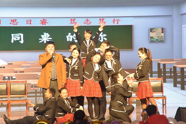 一身黄袍,两条红带,几把红扇,开场舞充满着喜庆的氛围,一首《中国全家福》调动了全场热烈的气氛,绚丽的灯光下,舞动着一张张朝气蓬勃的笑脸。吉祥物“喜羊羊”和“大嘴猴”出现,跳起了《小苹果》更让观众喜笑颜开。向经典致敬的小品《大话西游》,柔美婉约的个人独唱《圣诞结》,独具特色的舞蹈串烧,民族乐器合奏“锣鼓喧天”庆元旦。甚至还有十多个平均年龄都超过75岁的公司退休教师们,个个精神抖擞,欢快地的跳着舞蹈《筑梦者》,更有一位爷爷舞台上劈叉“一字马”贺元旦,“惊呆”了在场师生。