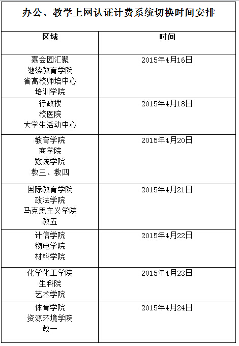 各有关单位: 为了配合校园网无线建设项目的实施,本学期公司将全面完成校园网认证计费系统改造工程的切换工作。为了保障上网认证计费系统运行顺利进行,现将有关事项通知如下: 一、本次切换包括所有的办公、区域楼宇(已完成切换工作的逸夫人文楼除外)。