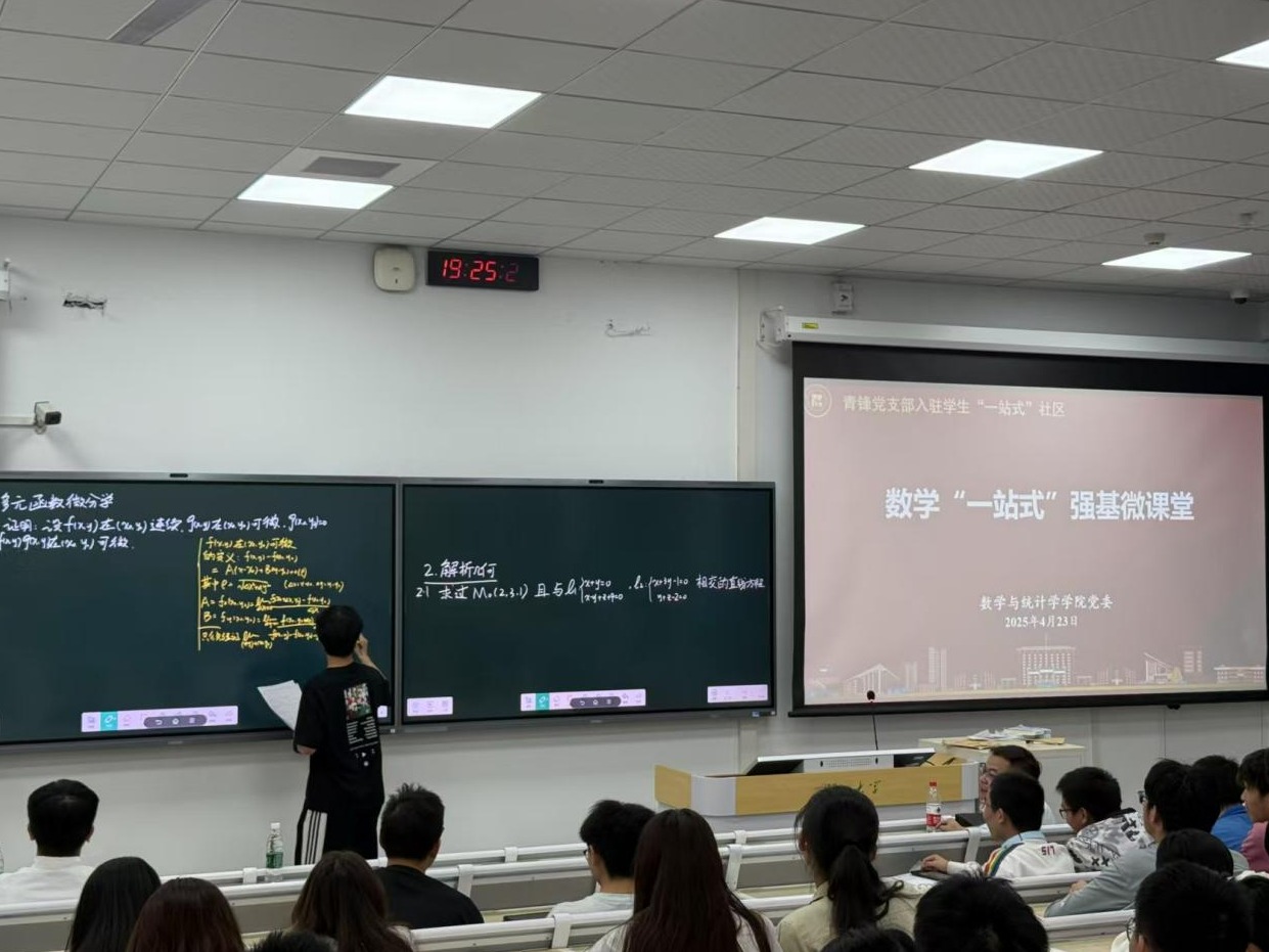 在高等数学、高等代数习题讲解过程中,青锋党支部员工党员2023级数学强基班覃勤同学在讲台上认真板书、讲解、示范,同学们边听边记、有时互动,记下工工整整的计算公式、密密麻麻的笔记……课堂气氛轻松愉悦、热烈非凡。