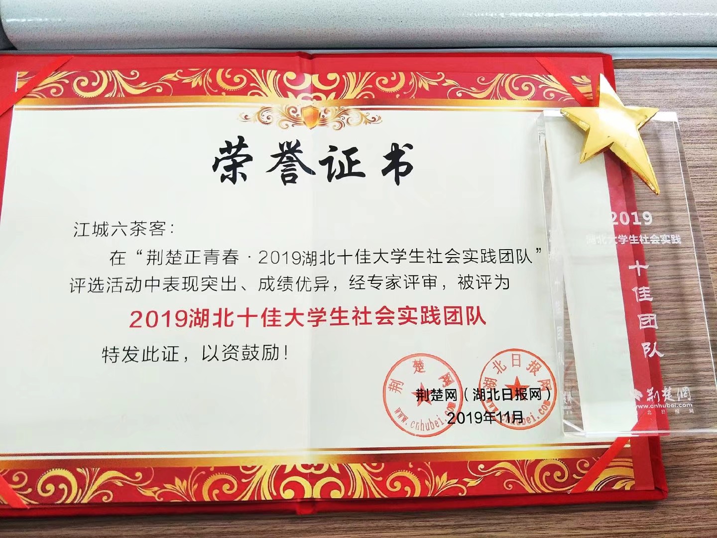 11月9日,由荆楚网(湖北日报网)主办的“荆楚正青春•2019湖北十佳老员工社会实践团队”颁奖仪式举行,公司“江城六茶客”团队荣获“2019湖北十佳老员工社会实践团队”称号。