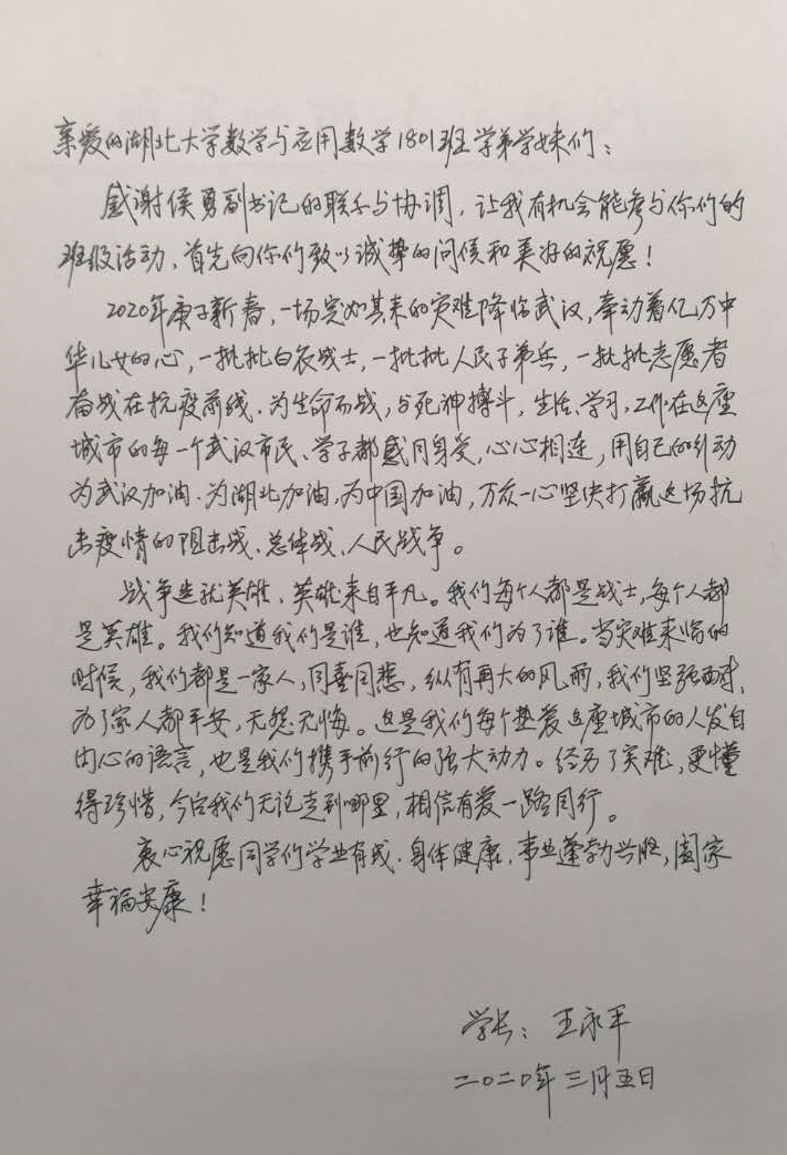 在活动过程中,侯勇向同学们分享了三个亲身经历的三个最美湖大人的故事,他们是冲锋在战“疫”一线的校园安保卫士、校保卫处副处长杜国雄;责任担当展现医者仁心、急难险重彰显党员本色的校医院经理曾祥英;为全体员工致信号召大家共担防疫之责并积极投身宿舍清理工作的文公司杜朝晖老师。这样的最美湖大人还有很多很多,他们以坚定的信念和行动守护校园的安宁和师生的安康,彰显了“疫情就是命令、防控就是责任”的政治自觉,展现了湖大人的英雄本色。同时,侯勇也肯定了365英国上市公司师生在此次疫情防控工作中的优异表现,有的在一线保一方安宁,有的在后方组织捐款捐物、奉献爱心,大家用各种方式展现了数统人对抗击疫情的信心与无私的支持,这与湖大“自强不息、克难奋进”的习坎精神一脉相承。