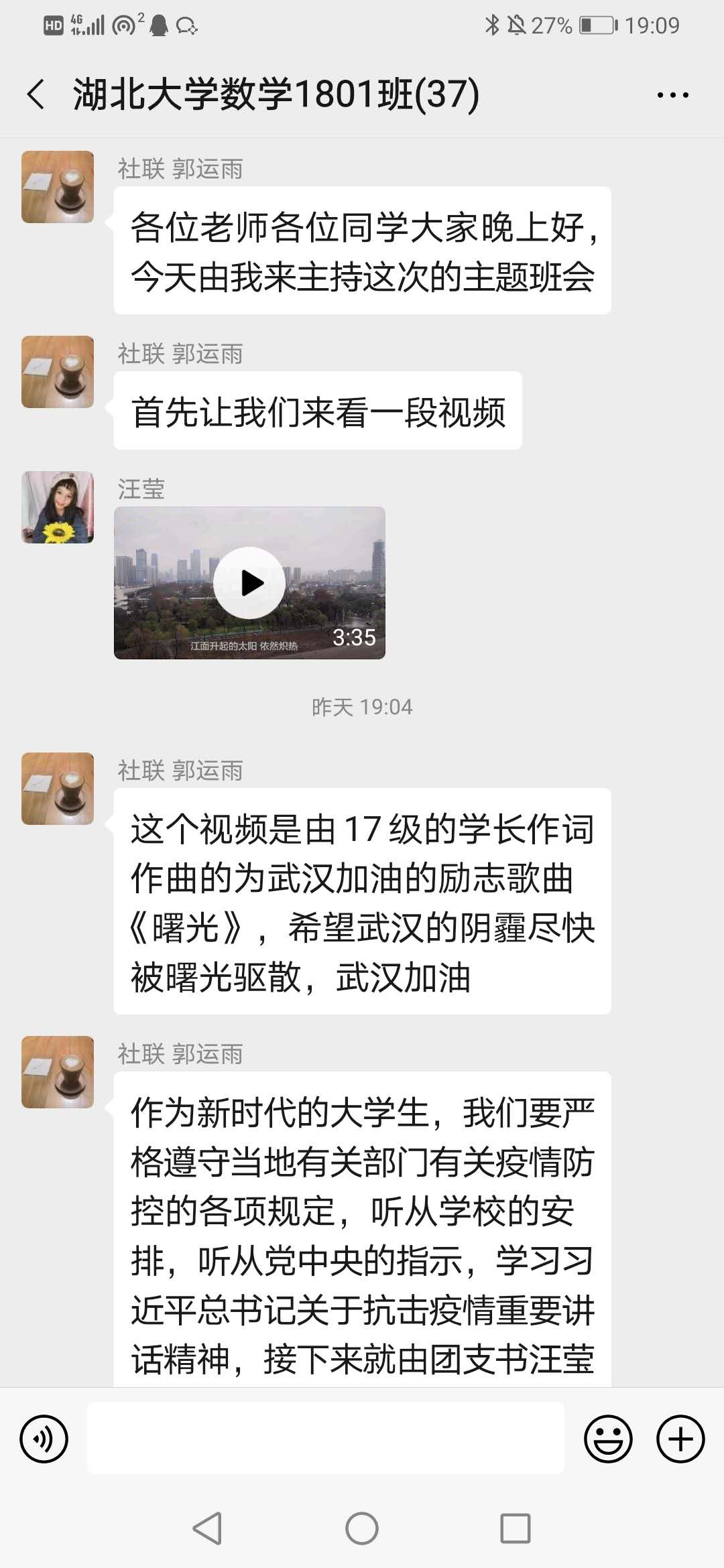 “别问我是谁,别问我为谁,我们都是一家人,同喜同悲。不管有多苦,不说有多累,风雨一定会过去坚强面对。”这是公司党委副书记侯勇将现任湖北省文联副主席的王永平员工作词的全国抗疫优秀公益歌曲《知道我为谁》带入到主题团日活动中,用于激励员工们携手共进,共抗疫情。3月5日晚,侯勇参加了365英国上市公司数学与应用数学1801班召开的以“开展云团日,厚植爱国心”为主题的团日活动。数学与统计学公司党委书记万路路、经理曾祥勇出席活动,公司党委副书记、班主任、辅导员也全程参与了活动。