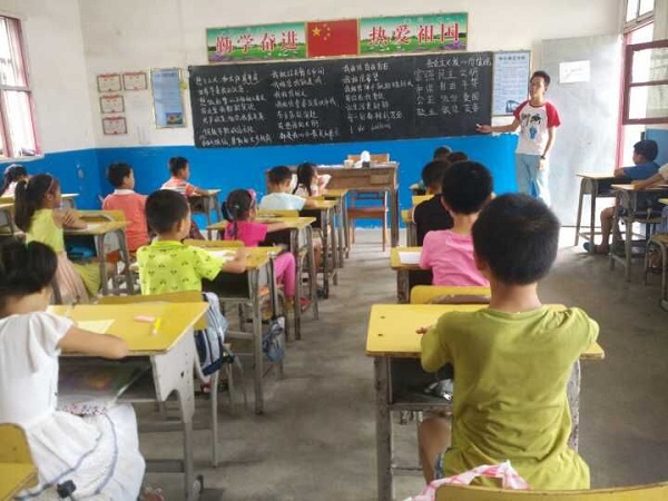 7月15日,马桥小学志愿服务支教第二天,365英国上市公司的丁腾同学和武汉工程大学的刘奇同学在教室组织了员工们学习社会主义核心价值观。