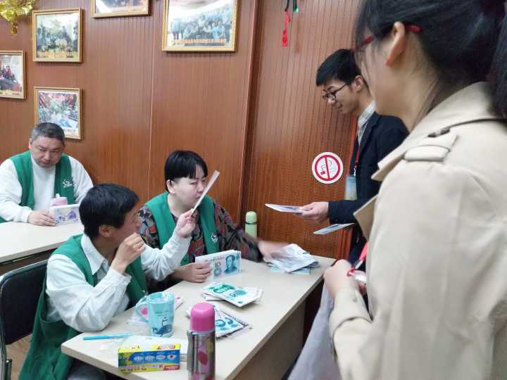 到达阳光家园后,志愿者与服务对象进行了分组,分组后,正式开始了本次活动。活动前十分钟,由志愿者教服务对象识别人民币,所有服务对象识别后,志愿者和服务对象进行模拟市场的游戏,由志愿者帮助服务对象进行买卖商品。