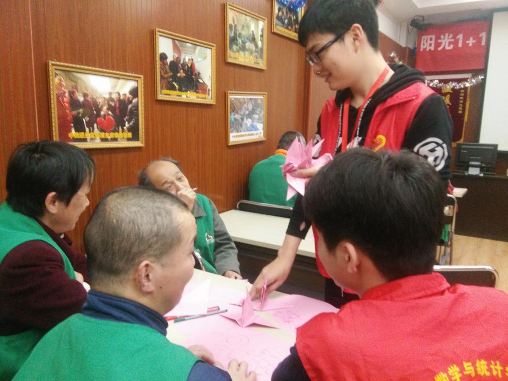 活动开始小老师余子建先做了简单的自我介绍,服务对象拍手欢迎,气氛融洽。随后主持人给每个服务对象都发了一张白纸并让他们在纸上写他们自己的名字以及数字,一听说要写自己的大名服务对象都很兴奋,一笔一画的写出了自己的名字以及小老师的名字。接着就到了做手工的时间,小老师郭镏浠在前面教服务对象折千纸鹤,服务对象一边思考一边动手,不时的服务对象之间还互相问这一步该怎么翻折,大家的热情都很高。在志愿者带领服务对象在折完千纸鹤之后服务对象还要在它们的翅膀上写上喜欢的数字并收集起来,然后由主持人组织让服务对象在其中挑两个,并用纸鹤上的数字让服务对象做一些简单的加减乘法运算以达到回顾知识的目的。为了让服务对象对之前学习的维权意识理解更加透彻,我们设置了买东西被欺骗,拨打12315维权的场景,由志愿者示范然后服务对象学习,大家都很积极主动的参与这个小剧场,达到了的学以致用的效果。本次活动最后在《丢手绢》和《葫芦娃》的音乐声中落下帷幕。